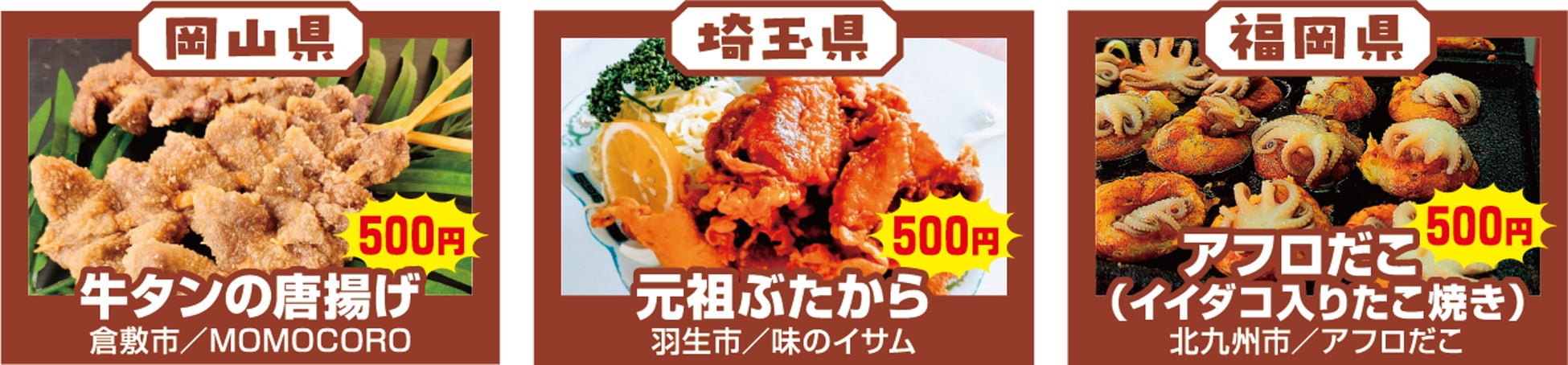 ※事前投票で現在TOP3のメニュー / 1位 牛タンの唐揚げ 2位 元祖ぶたから 3位 アフロだこ
